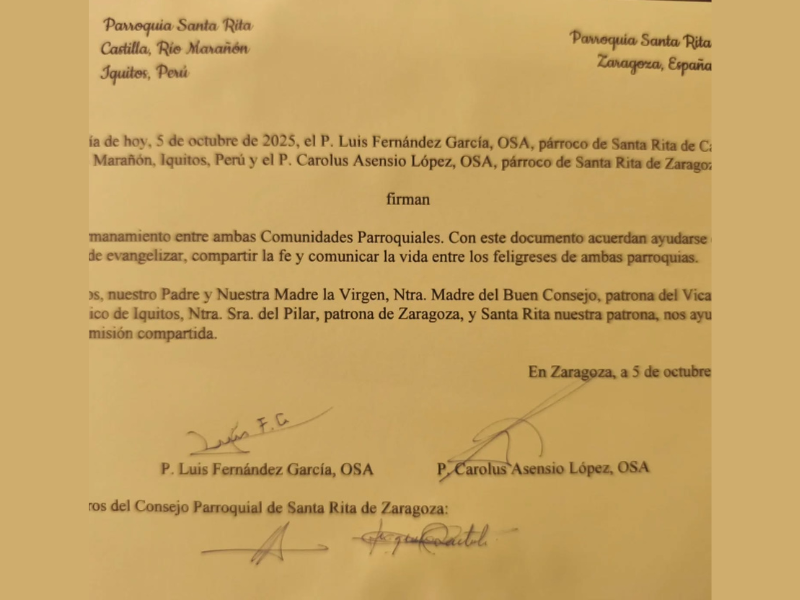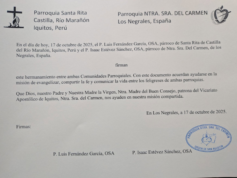 Dos parroquias agustinas de España, Ntra. Sra. del Carmen, en Los Negrales (Madrid) y Santa Rita, en Zaragoza, se han hermanado con la parroquia Santa Rita de Castilla, en la Amazonía peruana. Es una historia de solidaridad, fe compartida y colaboración internacional que ha trascendido fronteras geográficas. Tres comunidades, unidas por la espiritualidad agustiniana, han forjado un lazo espiritual y social que fortalece sus vínculos eclesiales, fomenta el intercambio cultural y el apoyo mutuo.