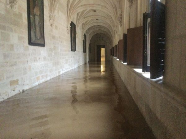 Estos centímetros de agua cubren, como puede verse en las imágenes, el claustro renacentista, su patio interior, las salas adyacentes (excepto el Museo, que está un escalón más elevado), la iglesia y la sacristía: «No hemos registrado daño, hasta ahora, en ninguna obra