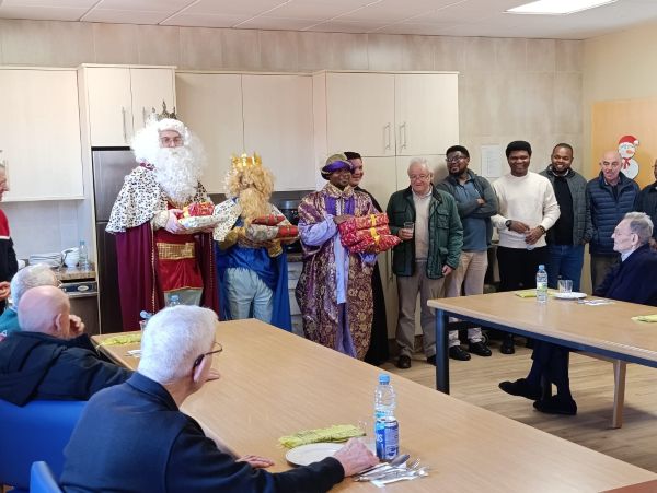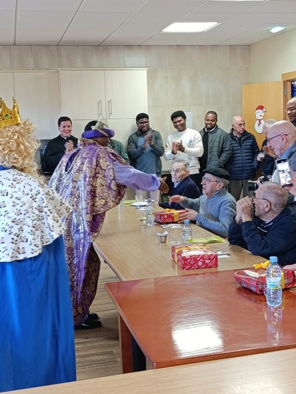 Finalizada la Eucaristía, Sus Majestades los Reyes de Oriente visitaron la residencia, ofreciendo sus dones y repartiendo regalos a los religiosos Alonso Gutiérrez, Alfonso Turrado, Paulino Moreno, Luis Franco, Francisco Prada, Emiliano Sánchez, Arsenio de Dios, Pedro García y Miguel Lanero.
